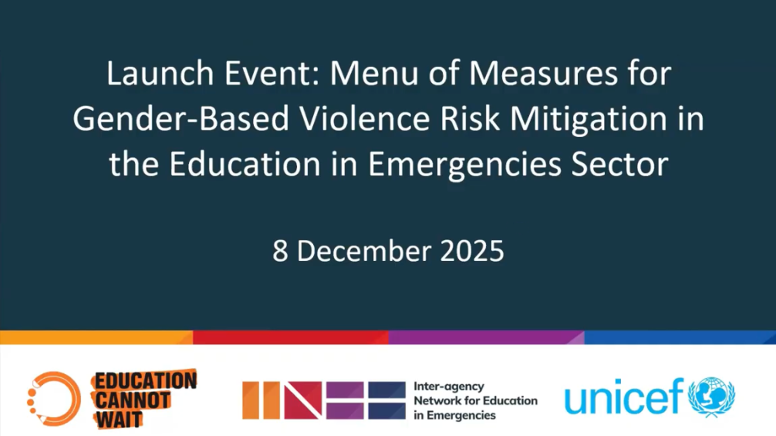 In observance of 16 Days of Activism Against Gender-Based Violence (GBV), the Inter-agency Network for Education in Emergencies (INEE), Education Cannot Wait (ECW), and UNICEF invite you to a webinar launching the Menu of Measures for Gender-Based Violence Risk Mitigation in the Education in Emergencies Sector. This web event will be conducted in English with interpretation in French and Spanish.